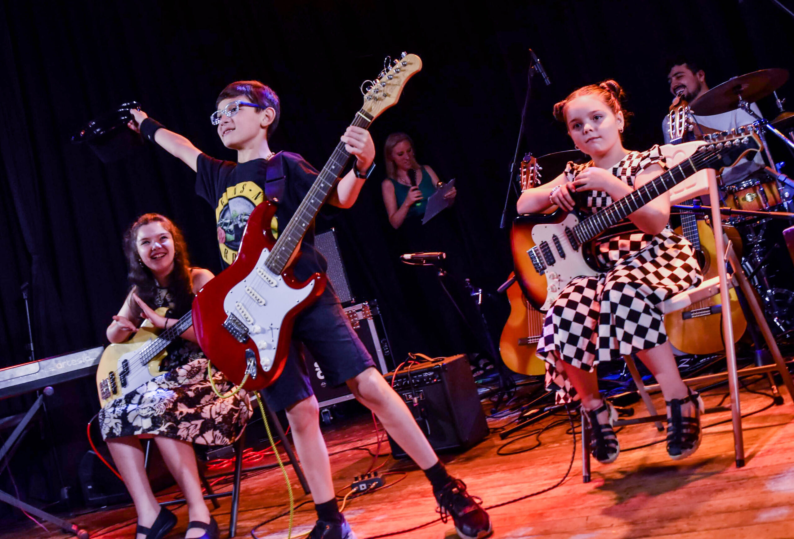 Los alumnos se presentan en vivo varias veces durante el año, con shows organizados en diferentes formatos y una gran muestra final en un teatro de la ciudad. Este programa está diseñado para salir del aula y vivir la experiencia real del escenario.